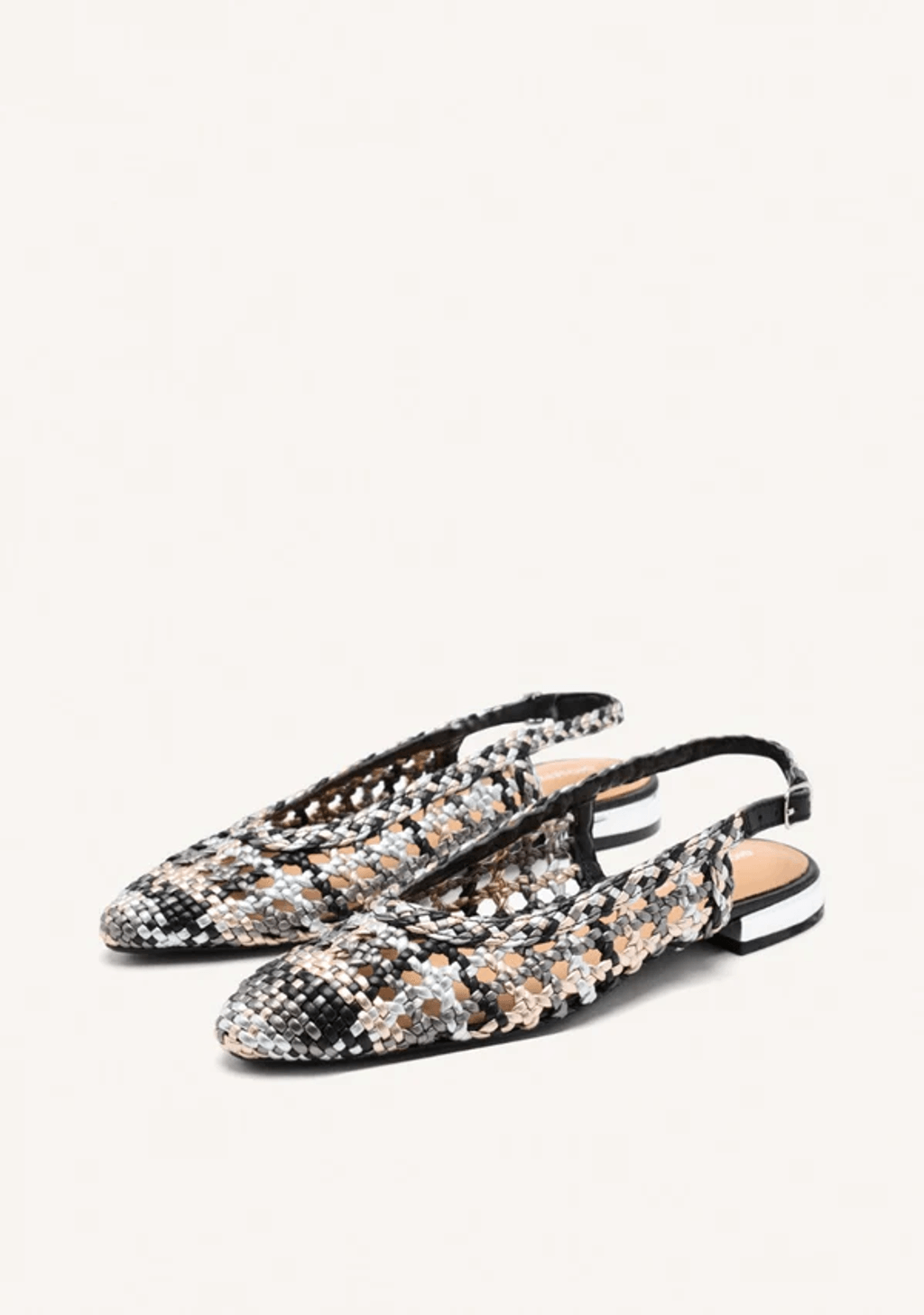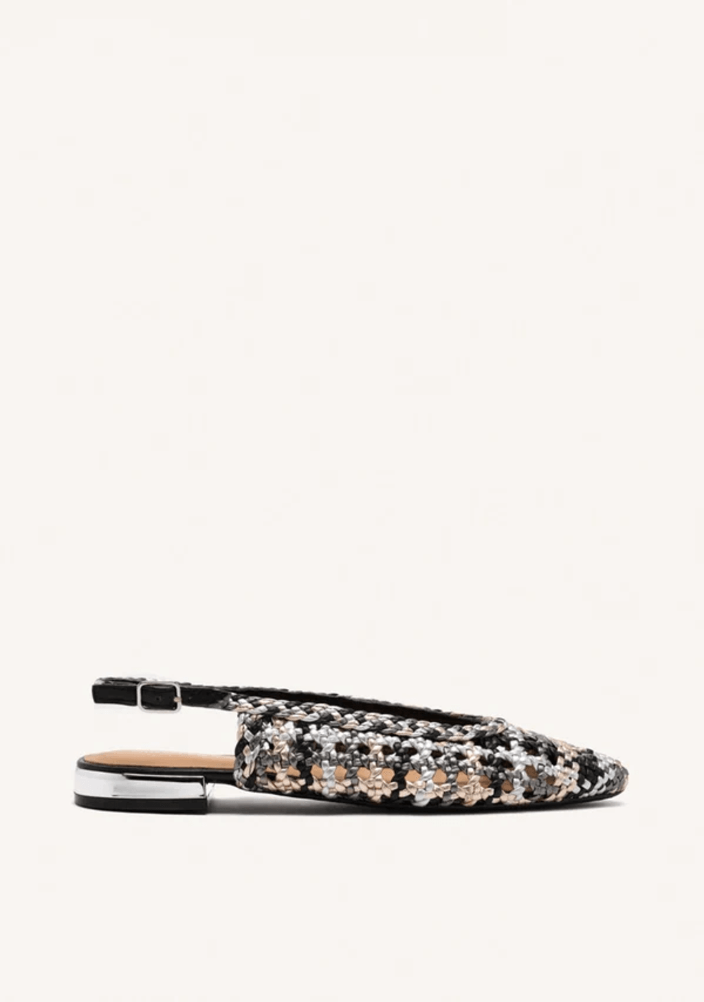 ¡Un imprescindible de la temporada que no te puedes perder! Bailarinas plateadas de piel con punta puntiaguda, piel trenzada y detalle trenzado en el empeine