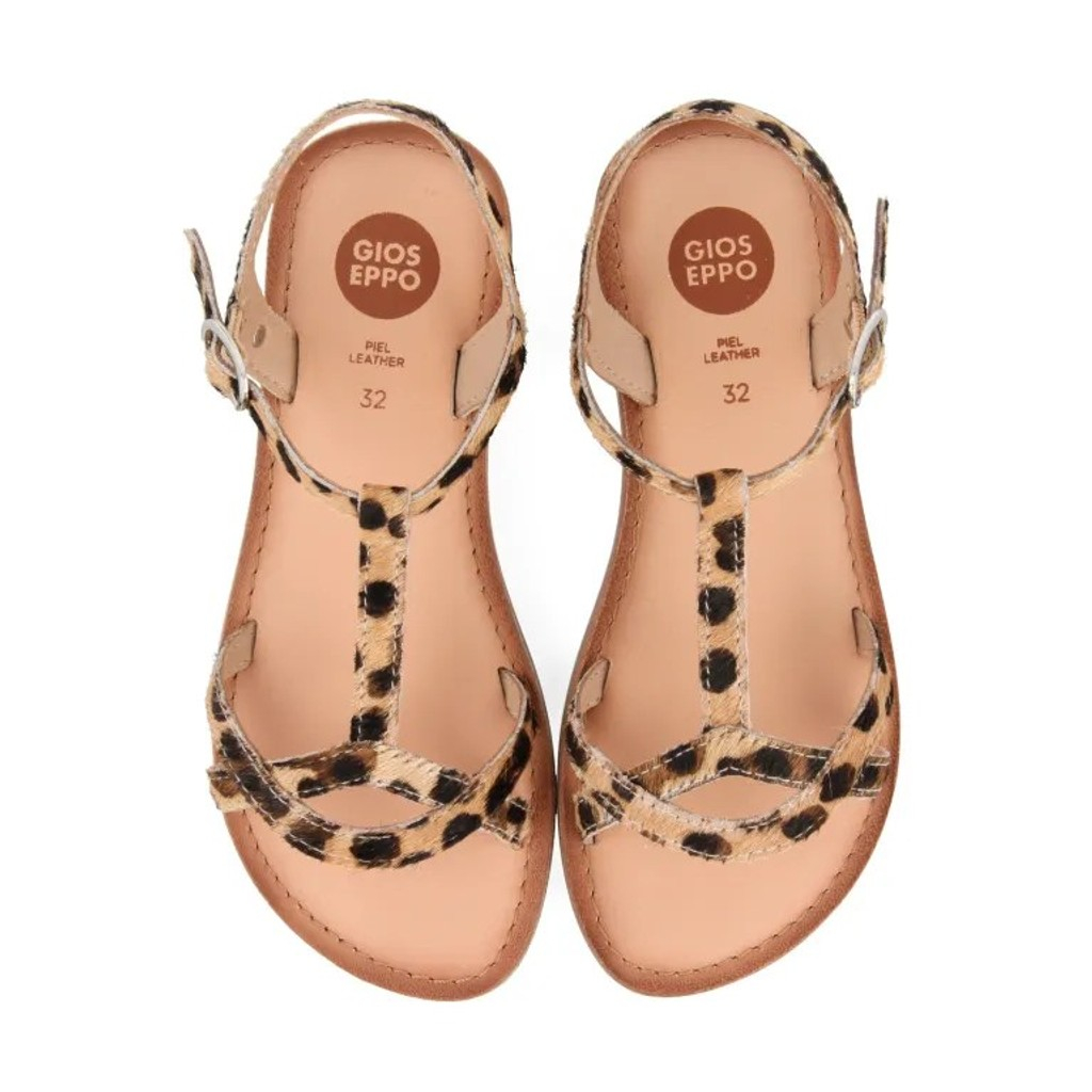 Sandalia de niña, realizada en animal print leopardo o vaca.