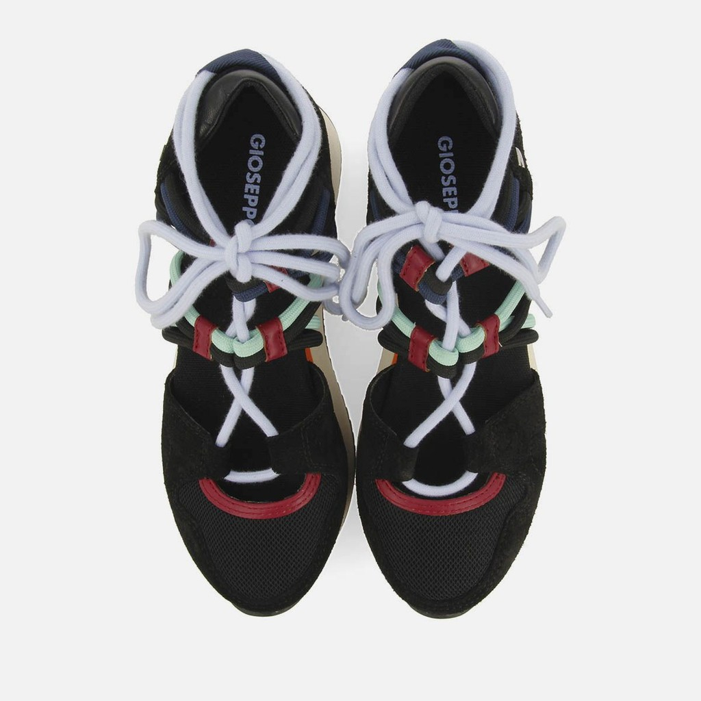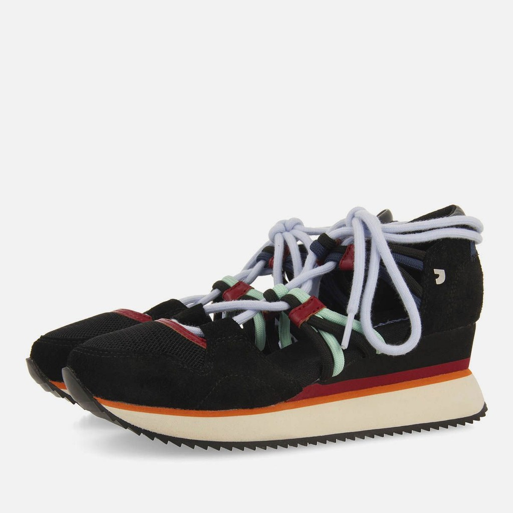 Sandalias deportivas con cuña, detalles elásticos y cintas anudadas.