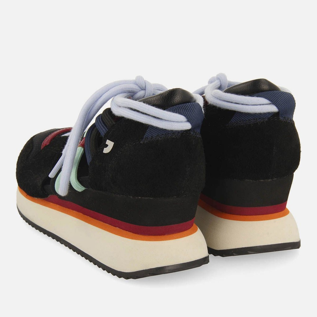 Los favoritos verano tras verano, ahora también en una versión más otoñal. Zapatillas negras con cuña y puntera abierta. Cuenta con plantilla acolchada y entresuela y cuña de EVA. Tanto el forro como la plantilla están fabricados en poliéster reciclado transpirable y el hilo de los tejidos utilizados en ellos cuenta con el sello de garantía certificado Global Recycle Standard (GRS).