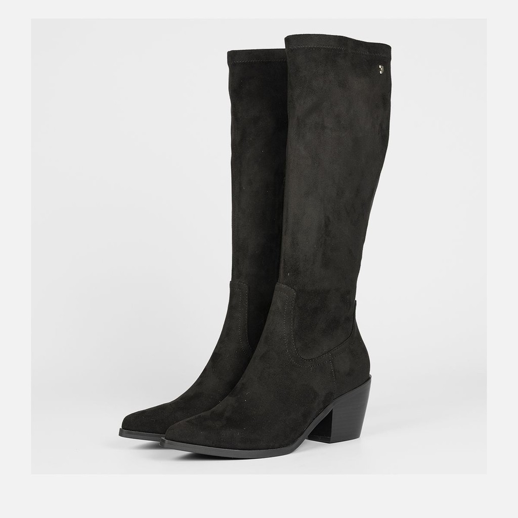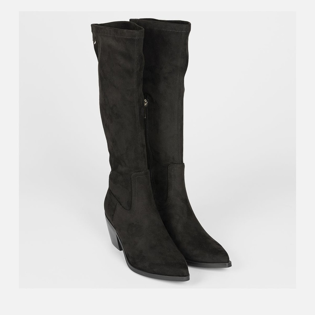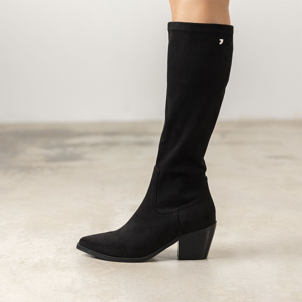 ¡Las botas XXL están arrasando! Botas altas de terciopelo negras con tacón bajo. Tienen una plantilla de piel transpirable y acolchada. La suela es de goma. Altura del tacón: 5,5 cm. ¿Te sumas a esta tendencia?