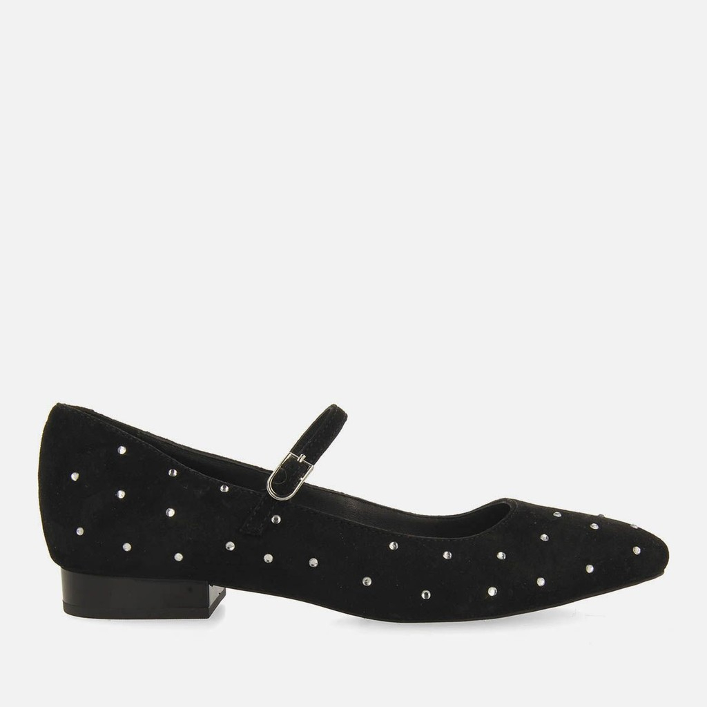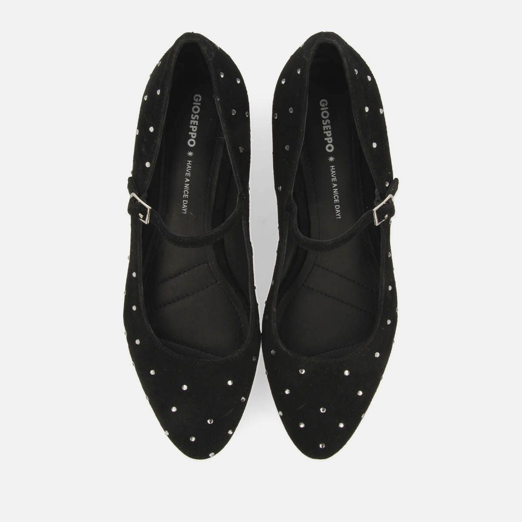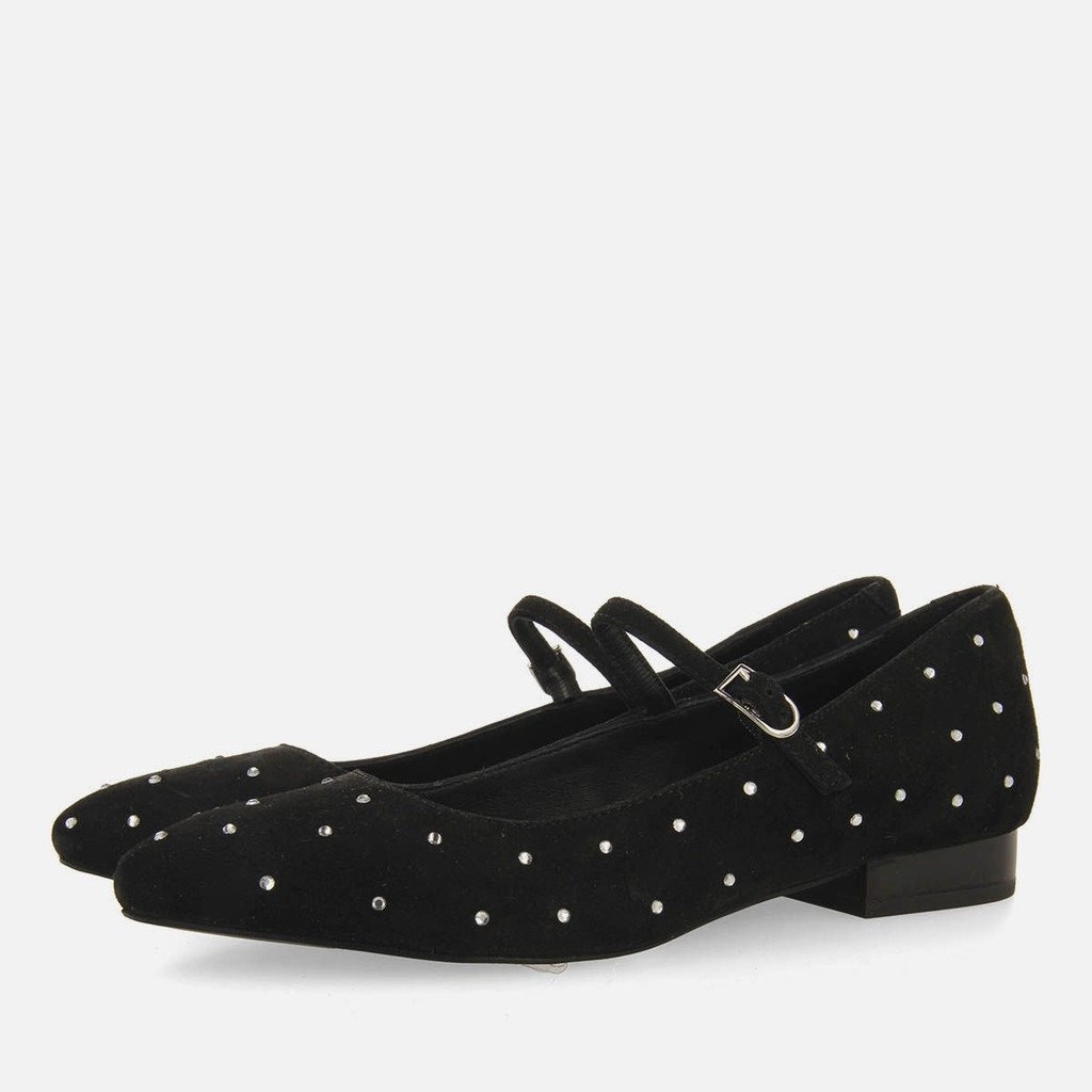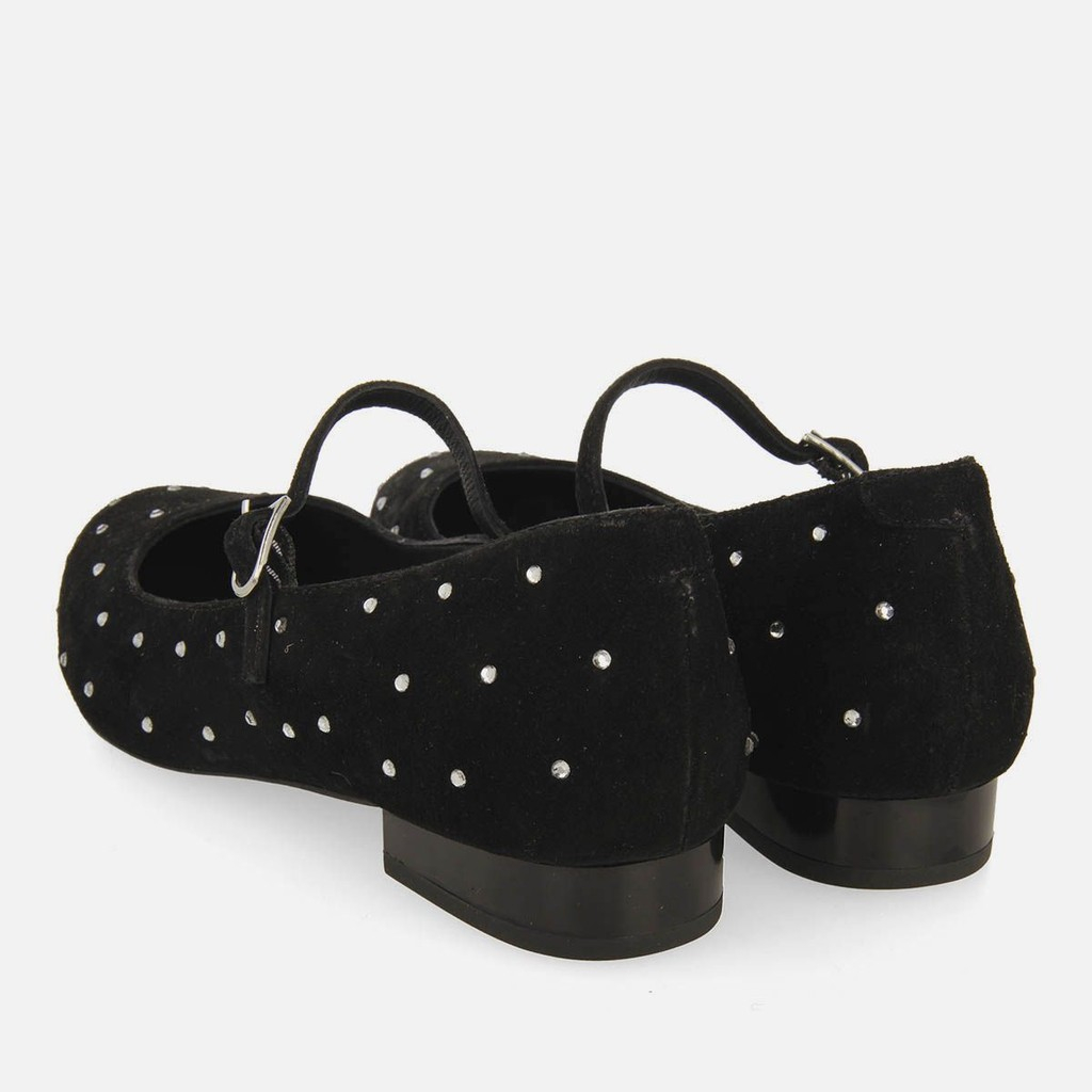 ¡El zapato tendencia de la temporada! Bailarina estilo mercedita en color negro confeccionada en piel con pedrería. Tienen plantilla muy acolchada, suela flexible y cierres ajustables. El forro, la plantilla y la parte superior están fabricados con piel curtida en curtidurías que siguen un proceso de curtido más sostenible, según los estándares del Leather Working Group (LWG). Los hilos de los tejidos utilizados en la fabricación del forro cuentan con el sello de garantía certificado Global Recycle Standard (GRS). ¡Te enamorarás de ellos al instante!