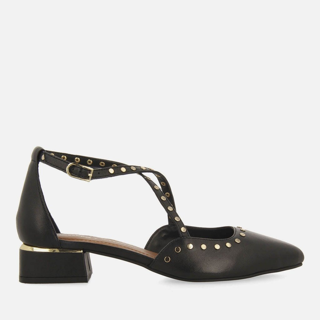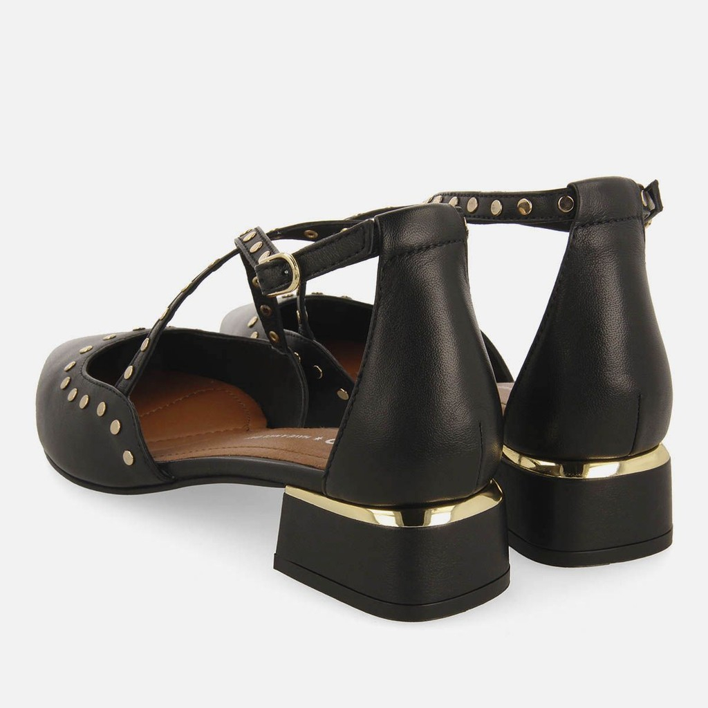 Una silueta clásica con un toque moderno. Salón destalonado en piel negra con tachuelas.