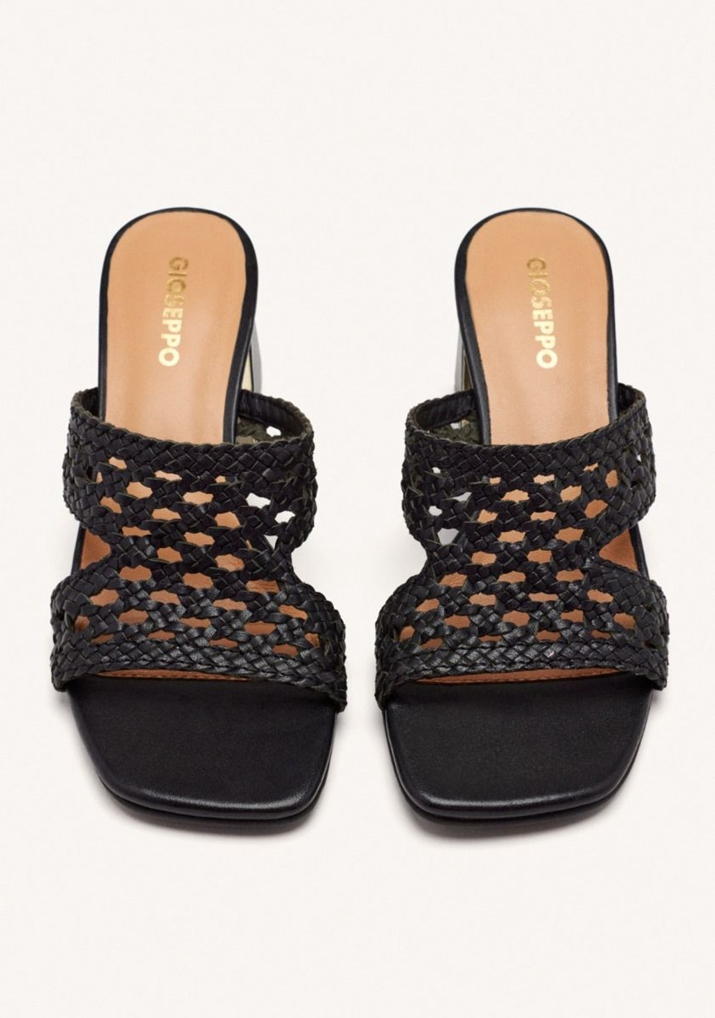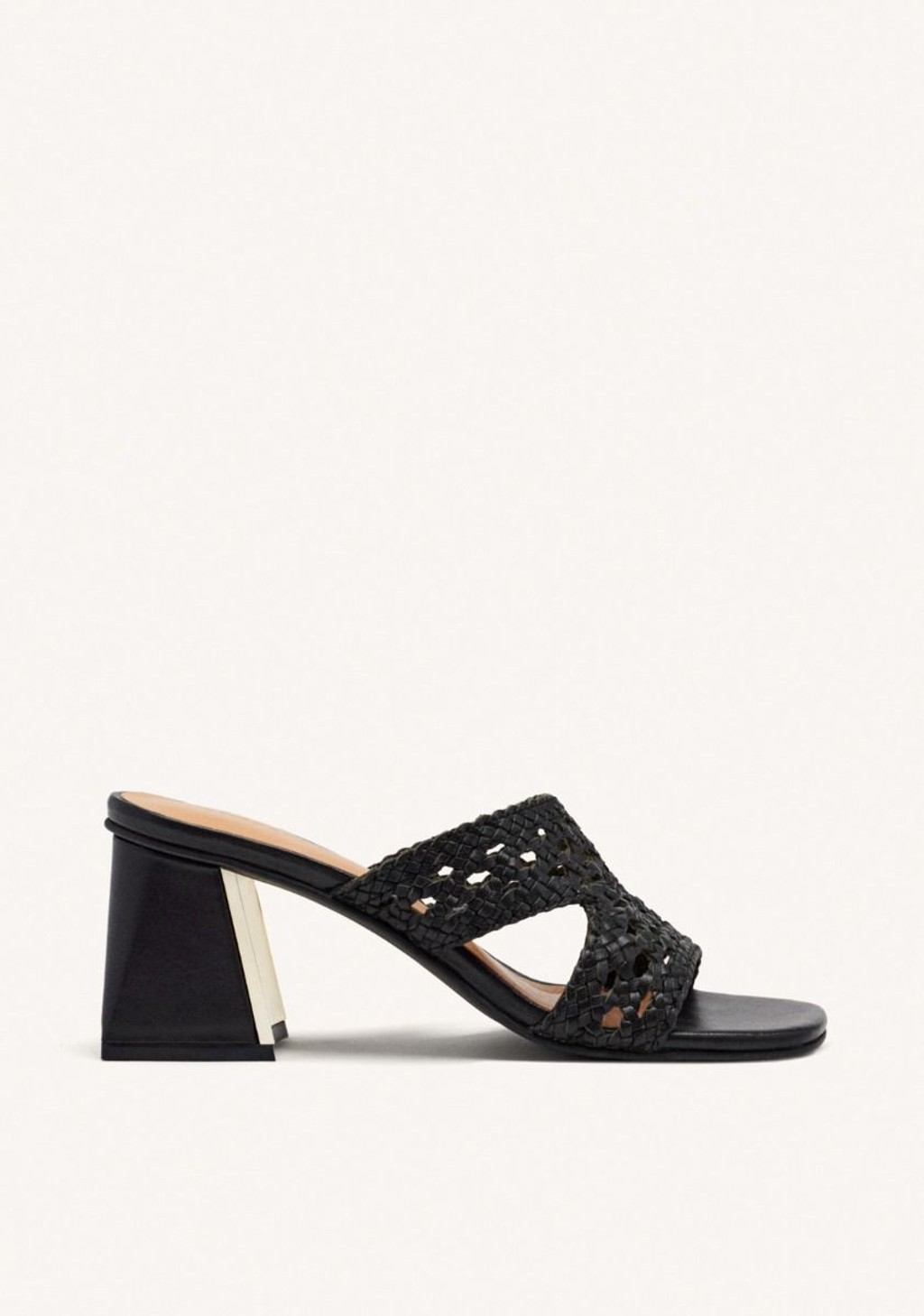 Sandalias tipo mules de tacón con trenzado de piel y acentos metalizados.