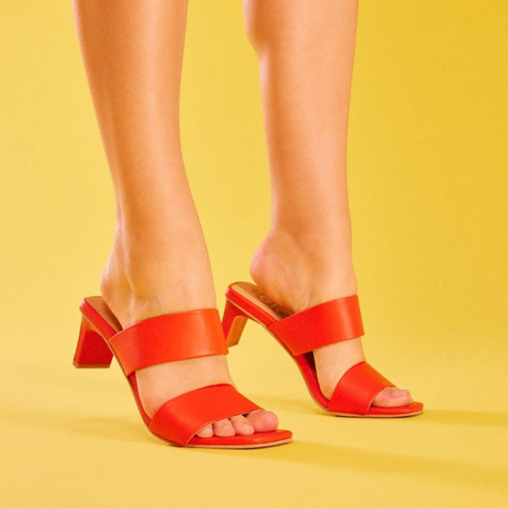 No te olvides del estilo este verano. Sandalias de piel color coral con tacón alto y doble tira.