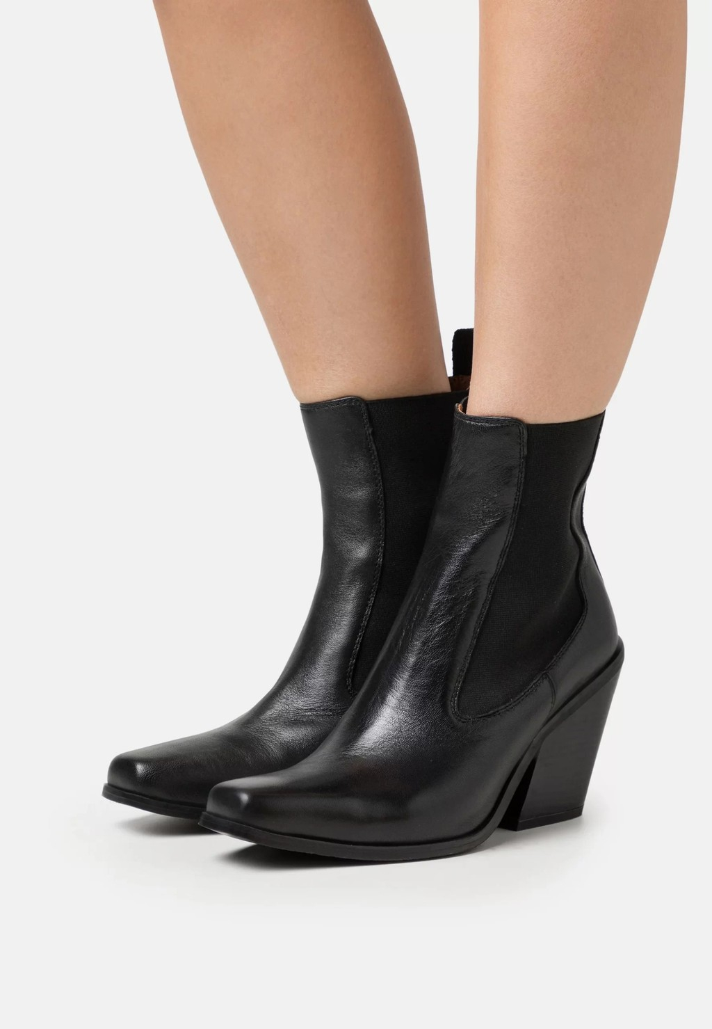 Botín estilo cowboy totalmente en piel con elásticos laterales y puntera cuadrada para mujer. Suela de materiales reciclados, planta fabricada con fibras naturales, forro y planta de piel curtidos de forma sostenible.