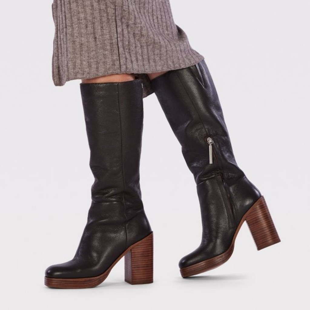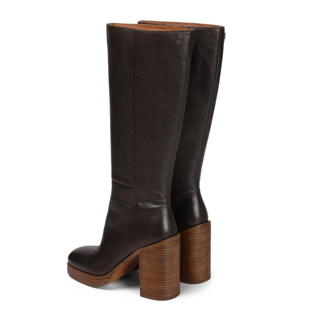 Botas de piel en color moka con caña alta, plataforma y tacón ancho en piel.