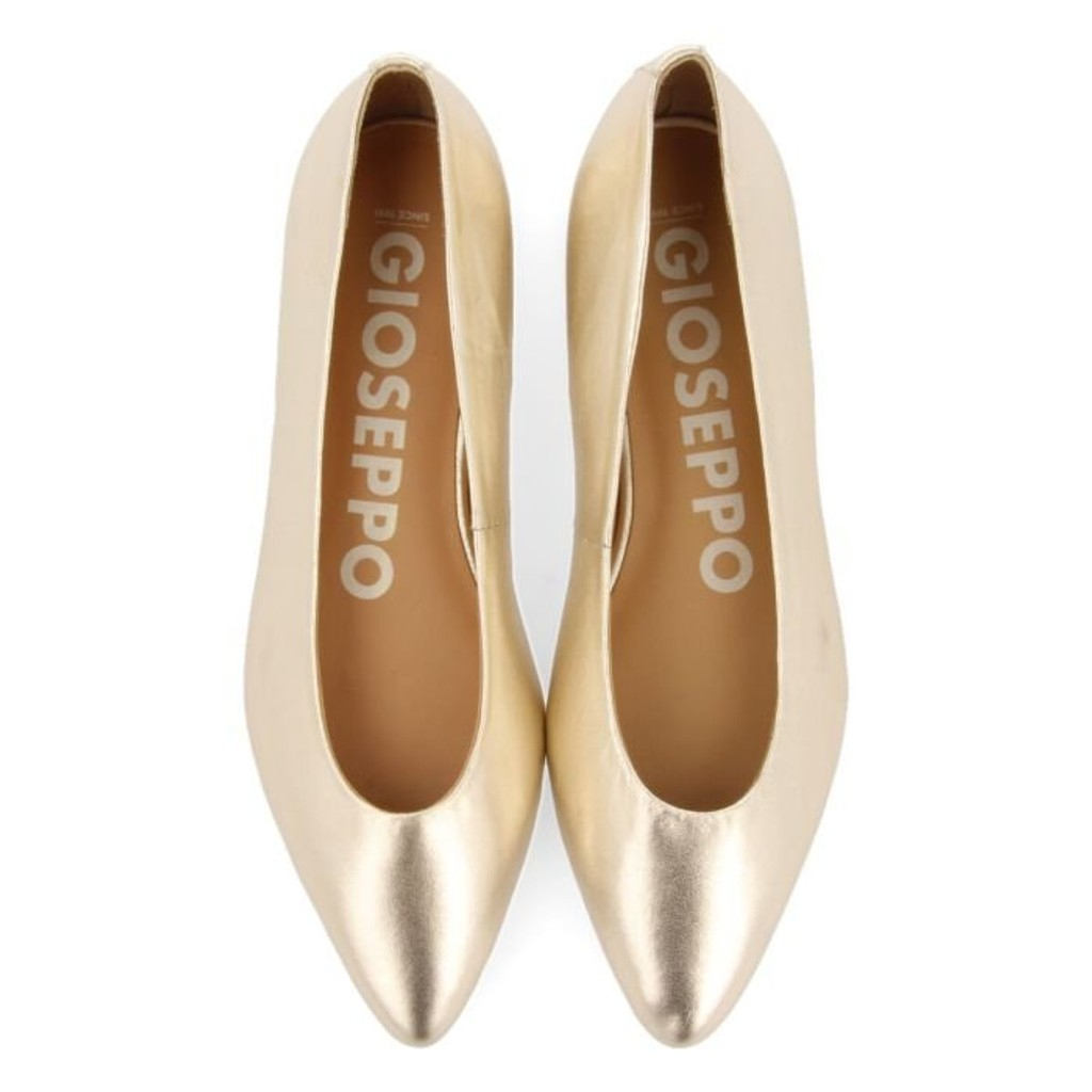 Bailarinas doradas totalmente en piel muy suave con puntera en punta. Plantillas de piel con amortiguación de látex.