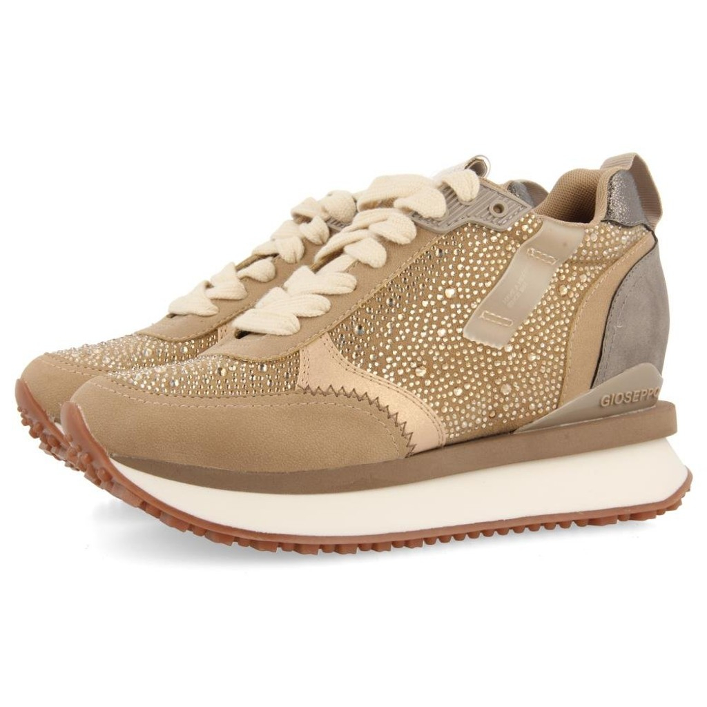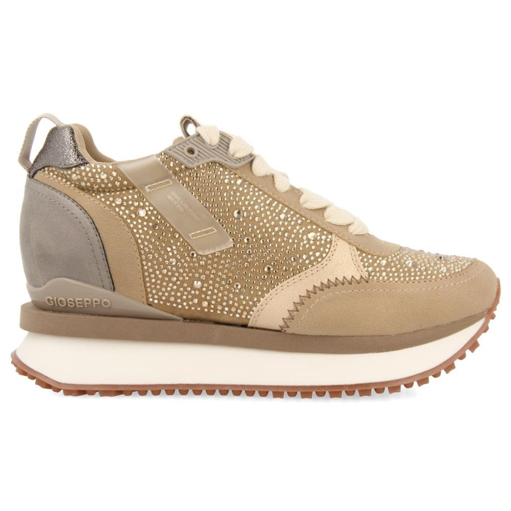 ¡Es hora de lucir esas zapatillas! Zapatillas monocolor beige con parte superior acolchada con detalles metálicos y cristales. Cordones de algodón orgánico. Plantillas anatómicas extraíbles. Forro y plantillas transpirables en poliéster reciclado. Suelas de EVA muy ligeras con dorso redondo y base de dientes de tiburón. Descubre todas las novedades de zapatillas deportivas de mujer de la nueva Colección Gioseppo Woman.  Cuna Interna Altura de 6cm.