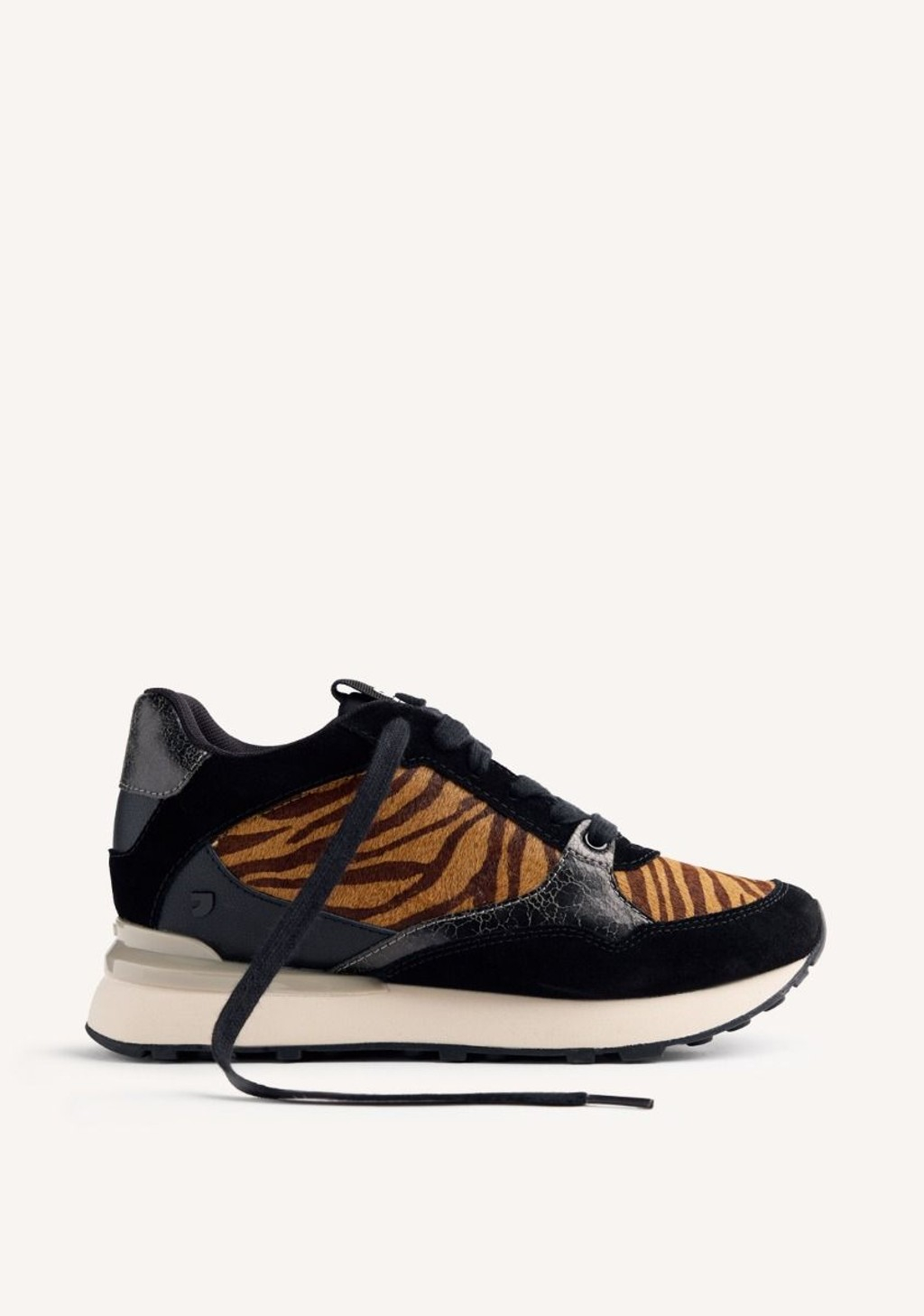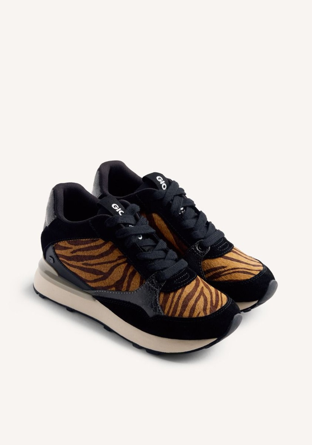 Zapatillas de ante con cuña interior. Combinan un estampado animal con efecto piel y detalles craquelados.
