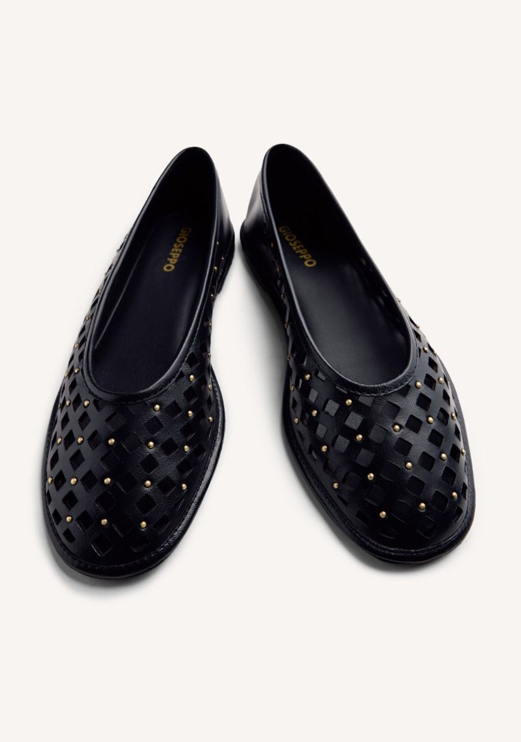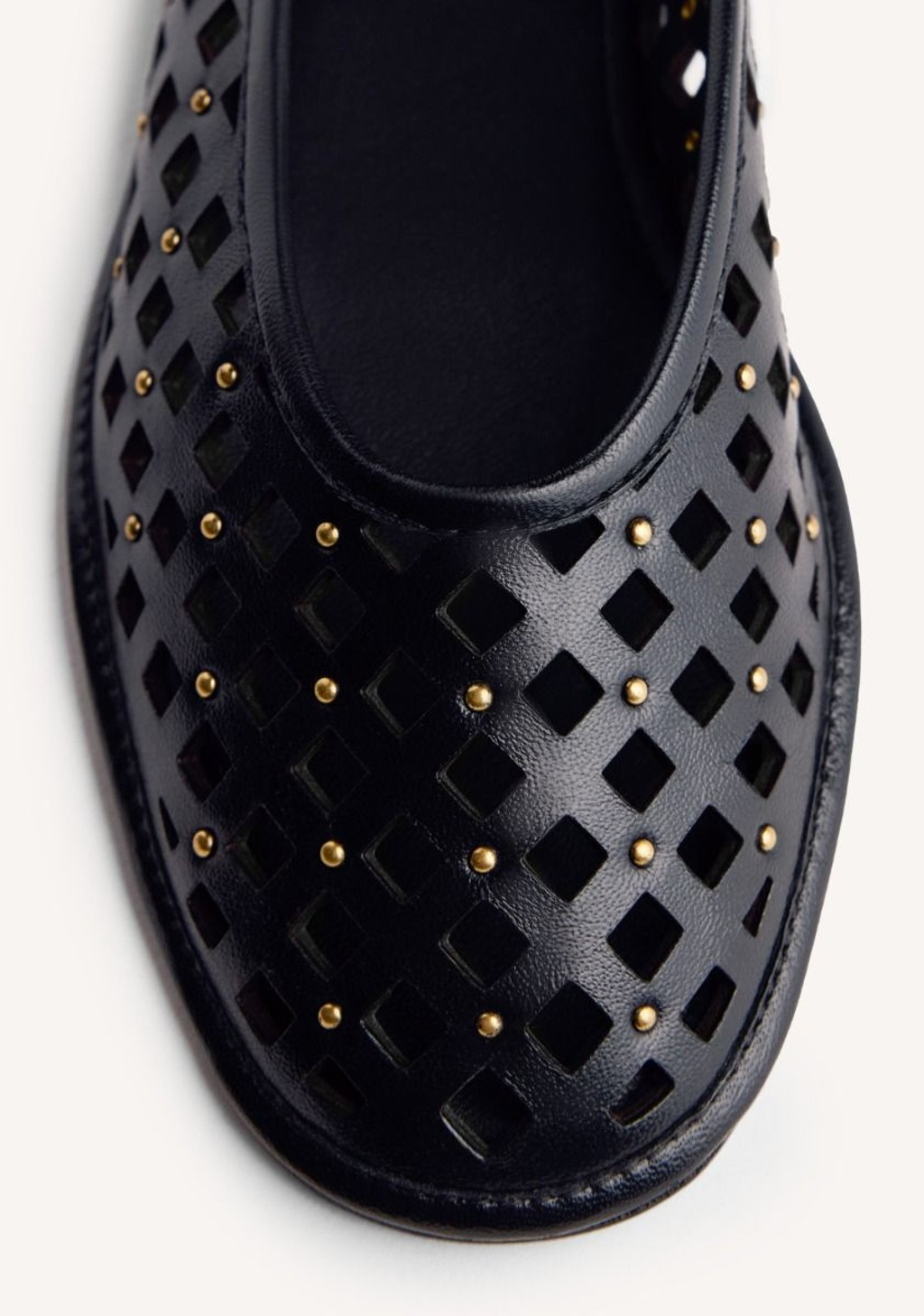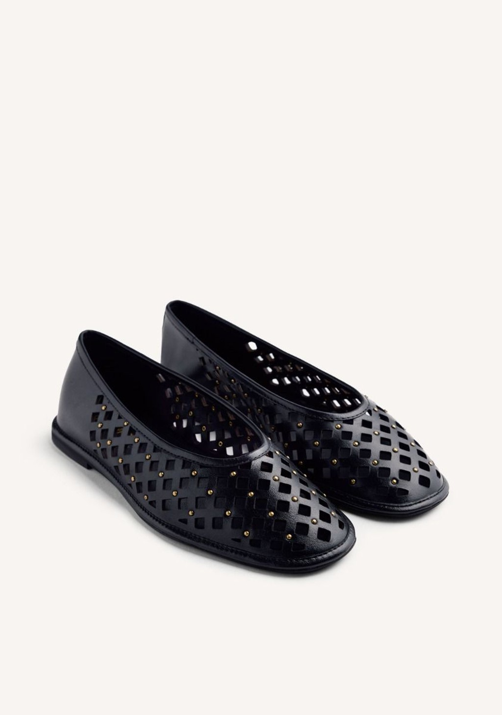 Bailarinas de piel calada con tachuelas doradas. Punta redondeada.